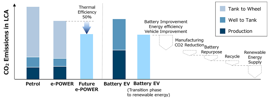 (LINK: Technology achieving 50% thermal efficiency) - Electric vehicles not only improve powertrain efficiency and can utilize renewable energy when charging, but with them Nissan is aiming to substantially reduce life-cycle CO2 by reducing newly mined resources during battery manufacturing and promoting battery reuse. Additionally, by utilizing electric vehicles as energy storage devices, they will contribute to promoting society's use of renewable energy.