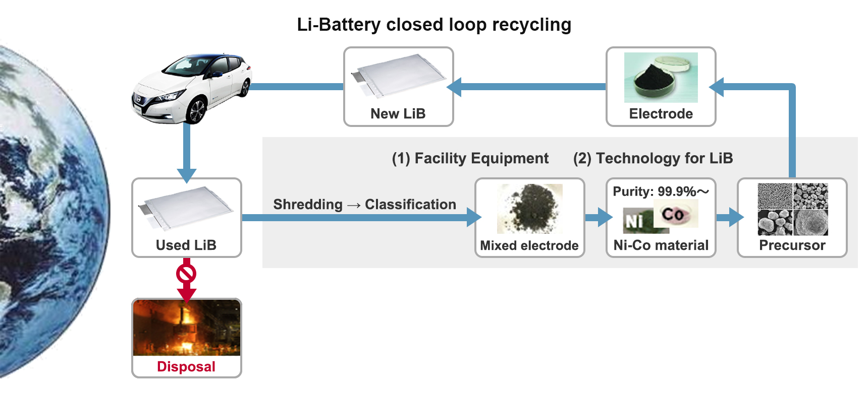 Nissan is preparing recycling technologies and equipment so that used batteries can once again be reused as resources. Instead of disposing of batteries, high-purity raw materials can be extracted by shredding and classifying the batteries, and, by reusing these resources in battery manufacturing, it is possible to reduce CO2 during battery manufacturing.