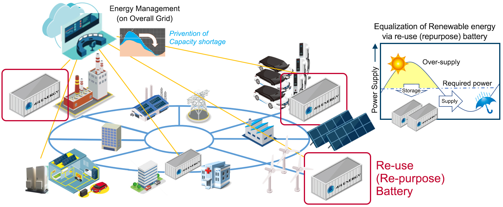 High-performance automotive lithium-ion batteries retain sufficient capacity as batteries even after being used for a vehicle, and used batteries can be effectively utilized by promoting the "4R" of "Reuse," "Resell," "Refabricate," and "Recycle." By utilizing these used batteries as energy storage devices for a variety of purposes, a battery reuse circulation cycle can be realized.