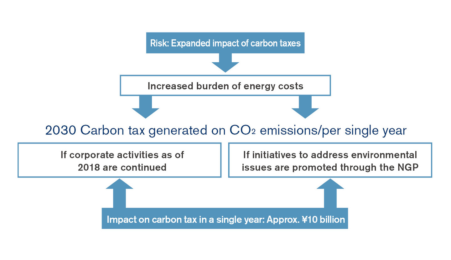 We estimated that the carbon tax impact of Scope 1 & 2 could be kept to approximately ¥10 billion if the environmental issues addressed in the Nissan Green Program were implemented, compared to the case where GHG emissions were not reduced.