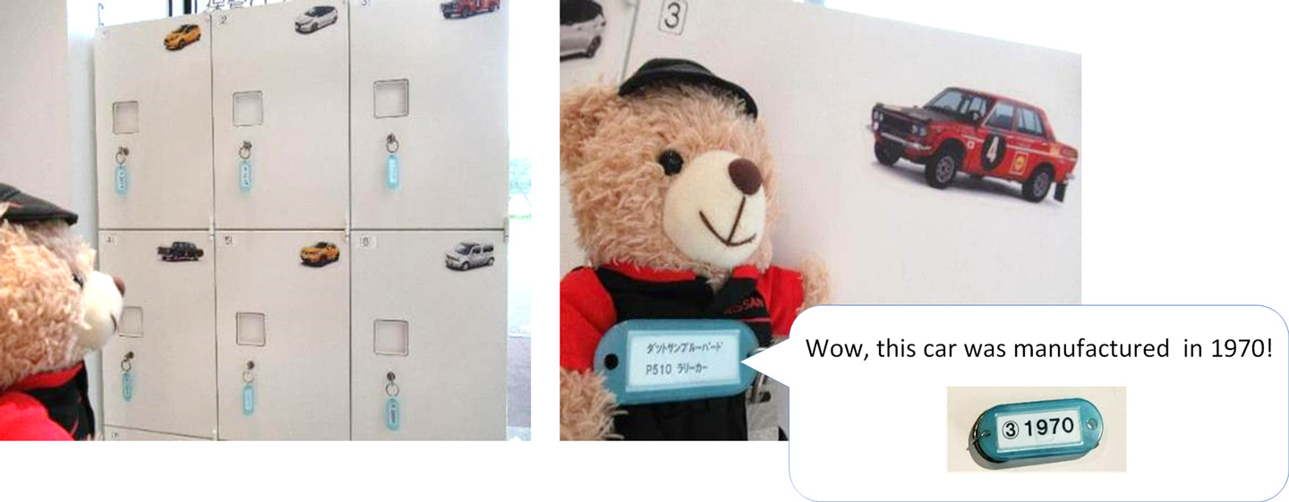 There are pictures of our successive cars manufactured at Oppama Plant displayed on luggage lockers at the entrance of the Guest Hall.