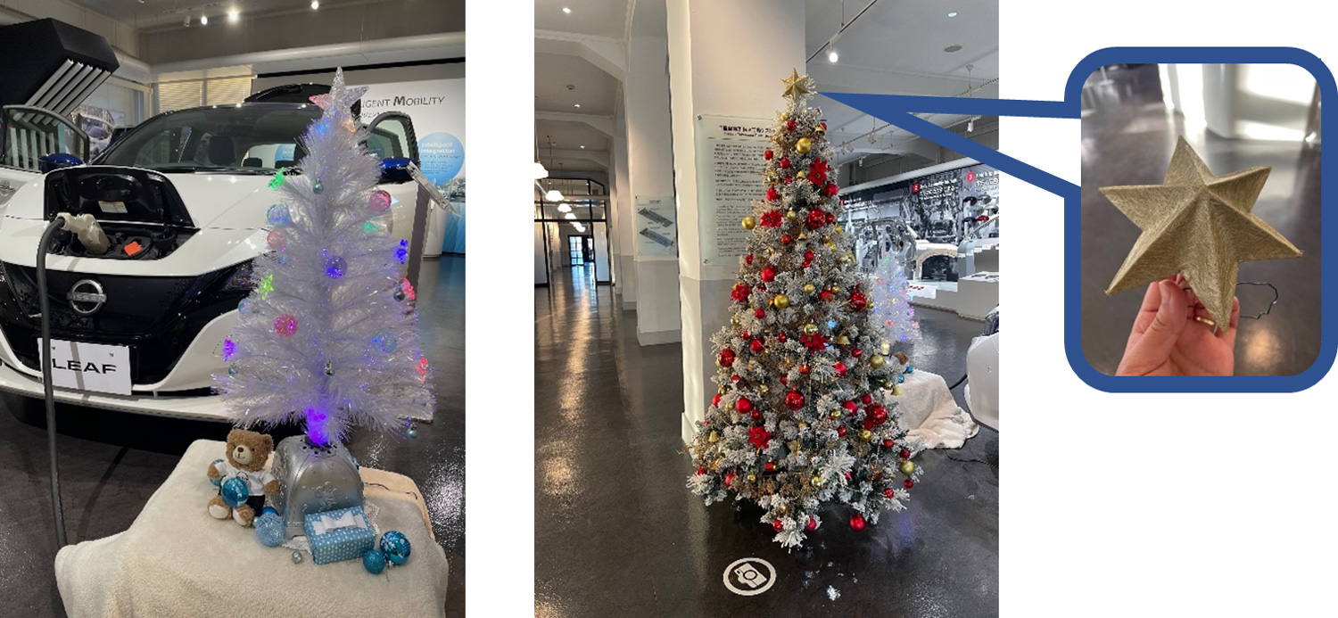 We use the electricity saved in a Nissan Leaf for Christmas LED tree lighting and on the top of the tree we decorated a star ornament which made from some scrap materials in the plant and its a one-of-a-kind.