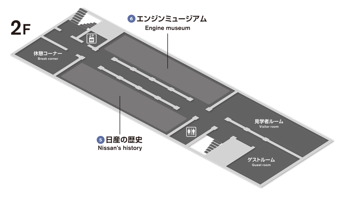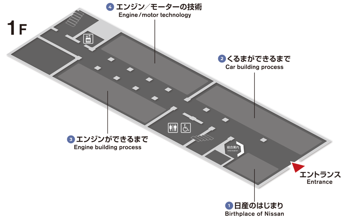 The Guest Hall was certified as a historical building by Yokohama City in 2002, as "Nissan Motor Co., Ltd. Yokohama No. 1 Building (former head office building) Inside the building, you can learn about the history of Nissan, see the Engine Museum - which displays the engines of the past, as well as engine and motor technology exhibits - and see how cars and engines are built.