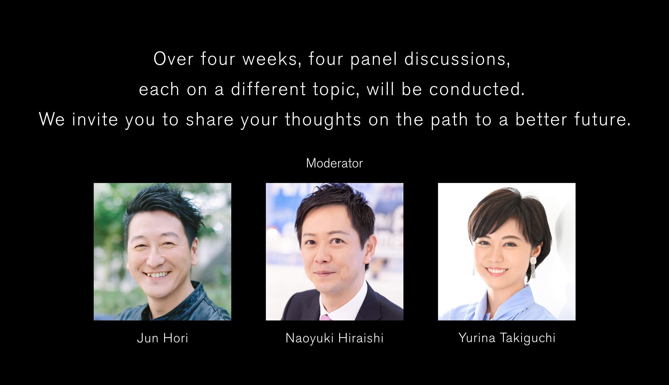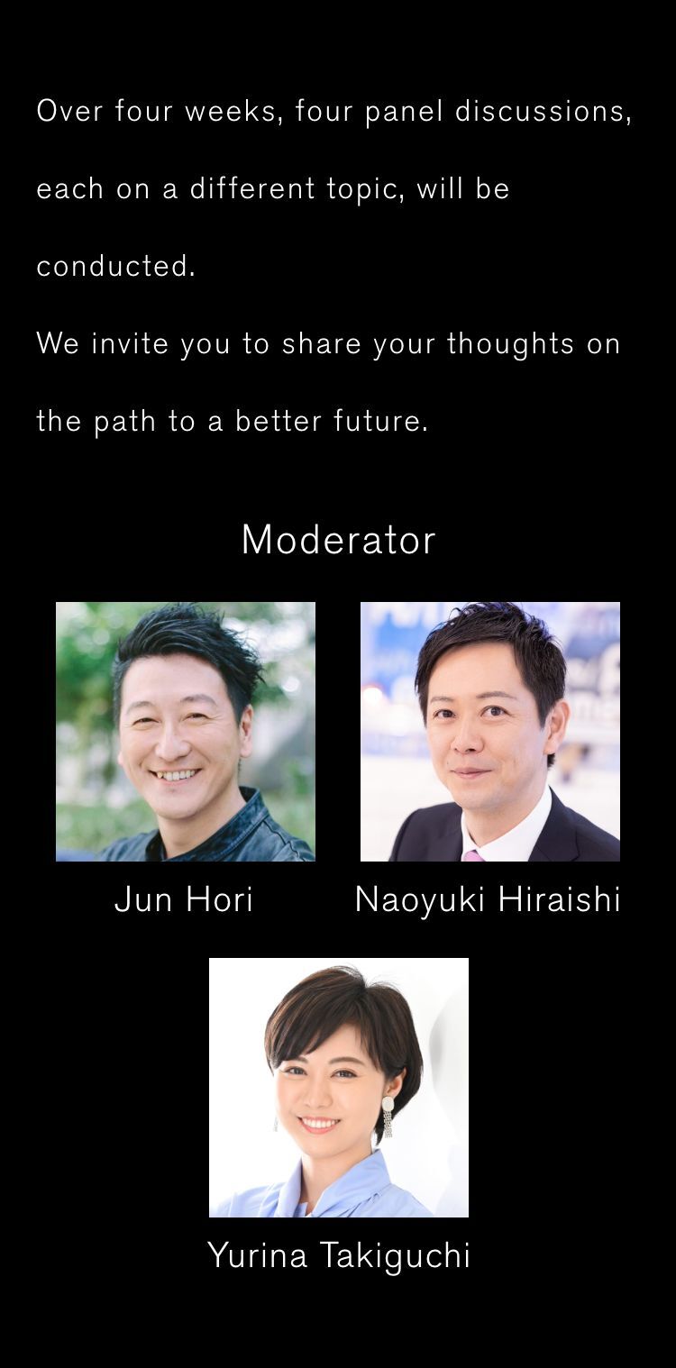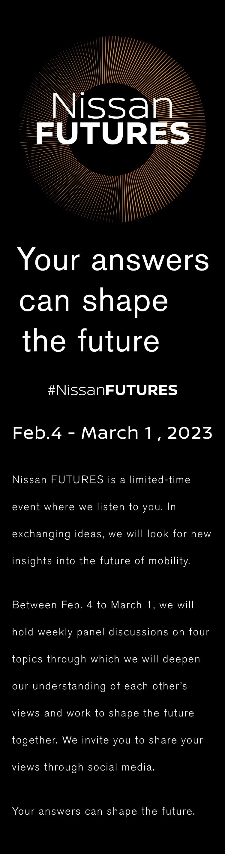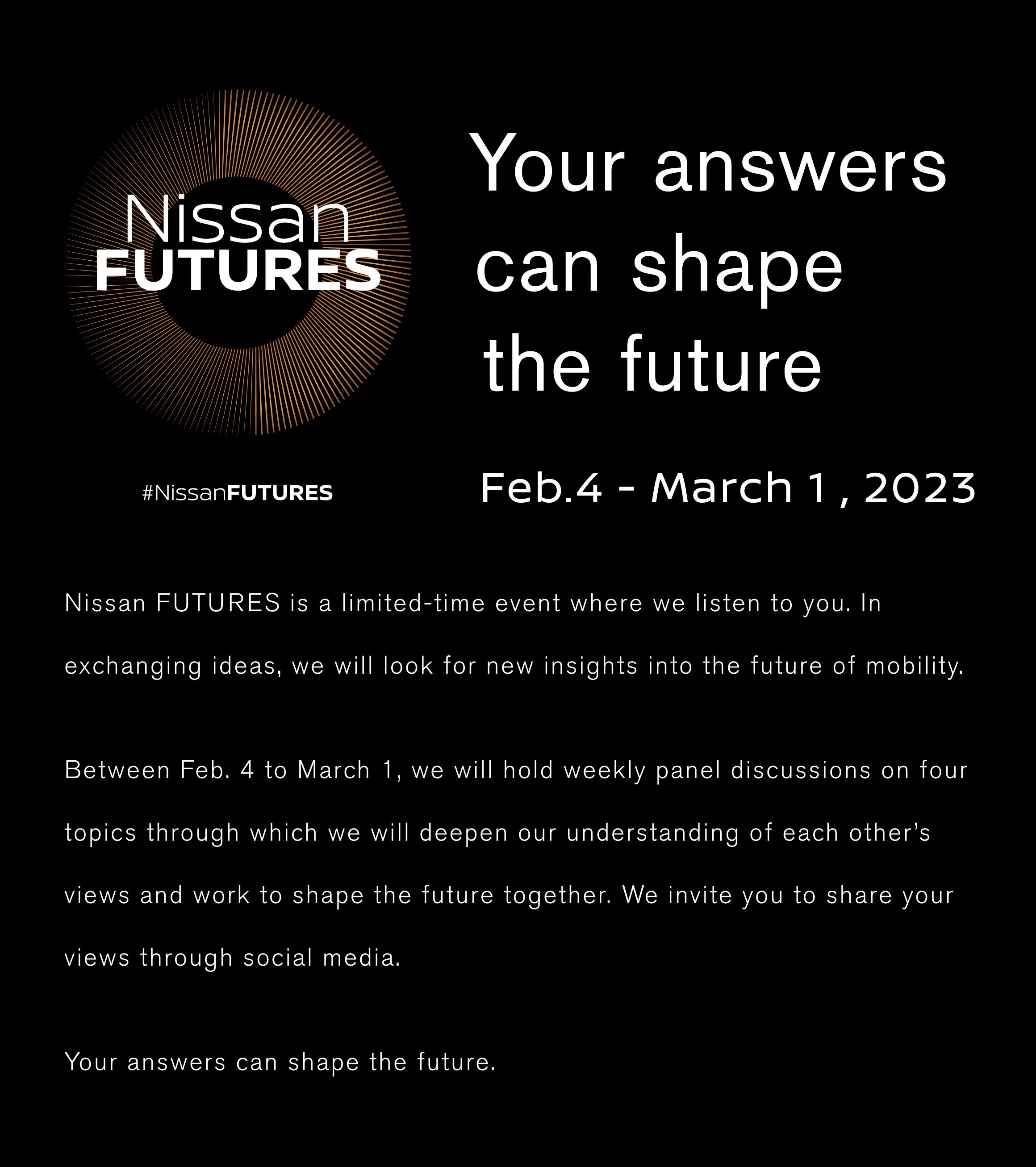 Centering on four topics - Sustainability, Economy, Innovation and Culture - that are vital to the future, each weekly discussion will introduce Nissan's initiatives and encourage everyone to share their views on our future together.