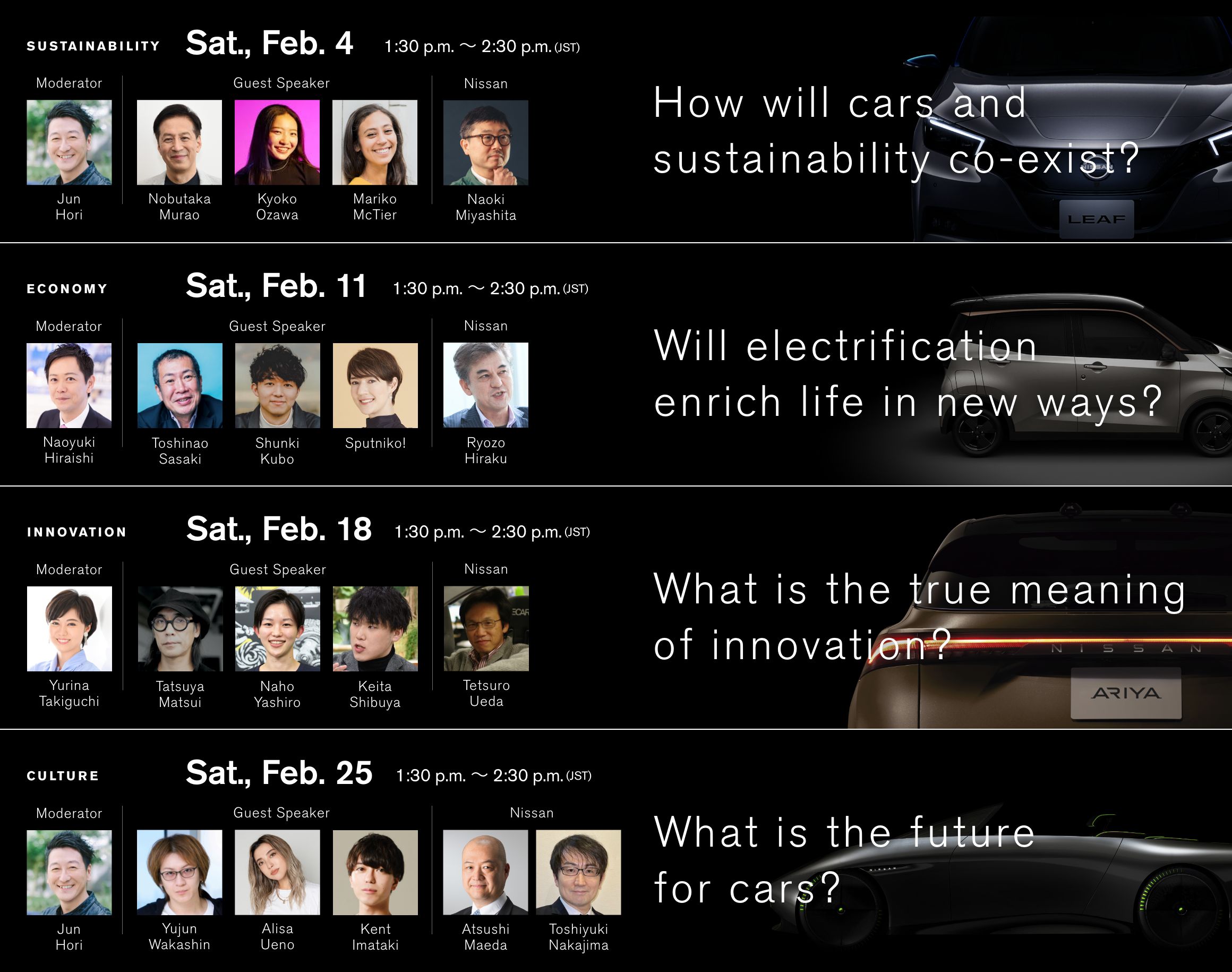 TALK 4 FUTURES: Four Saturdays (Feb. 4, Feb. 11, Feb. 18, & Feb. 25) at Nissan Global Headquarters Gallery If you are unable to attend in person, please visit the Nissan YouTube channel for information on recordings. Online Special Talk Session: The video is uploaded on YouTube. |