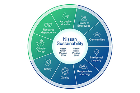 Nissan’s purpose places sustainability at the core of the business. This means working toward a cleaner, safer, more inclusive world continues to define how we develop products, technologies, and services. From talent management to supply chain to product design and the entire lifecycle of our products, sustainability is a priority throughout Nissan’s business. We have accelerated our sustainability strategy by introducing the Nissan Green Program 2030 (NGP2030) and Nissan Social Program 2030 (NSP2030). These programs will provide a foundation for our business plan and help us realize our Ambition 2030 vision.