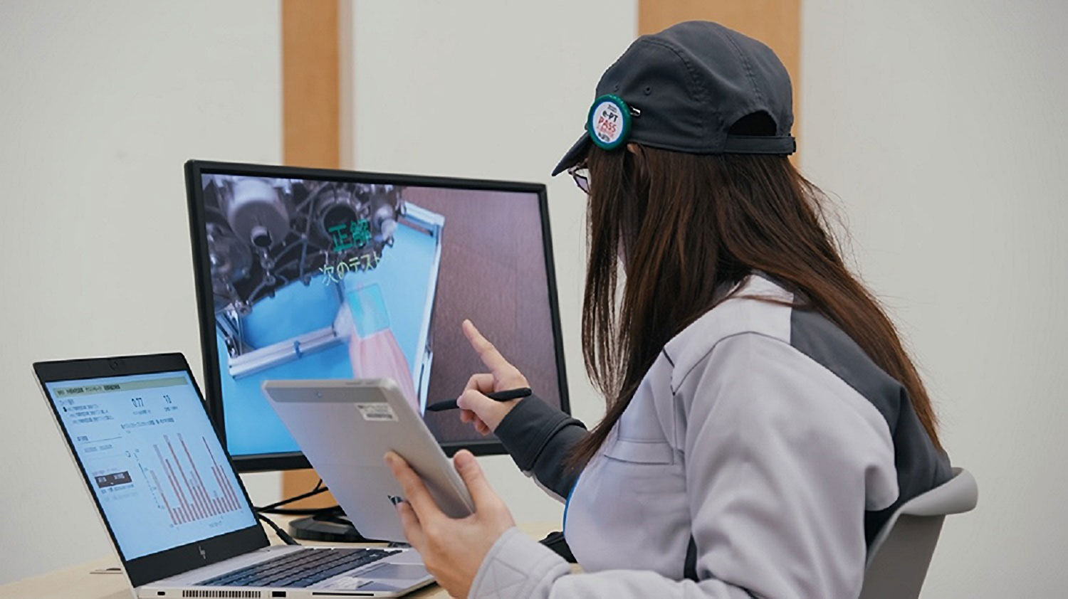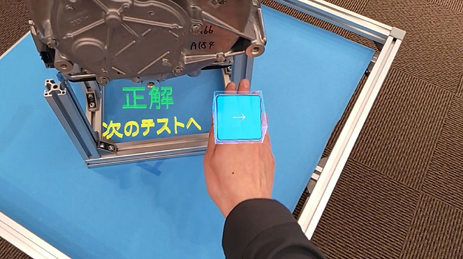 When wearing the MR goggles, pictures and text are superimposed onto a physical e-powertrain, allowing the trainee to immediately grasp the work first-hand. The trainees can review their understanding by pointing to the areas to be checked.