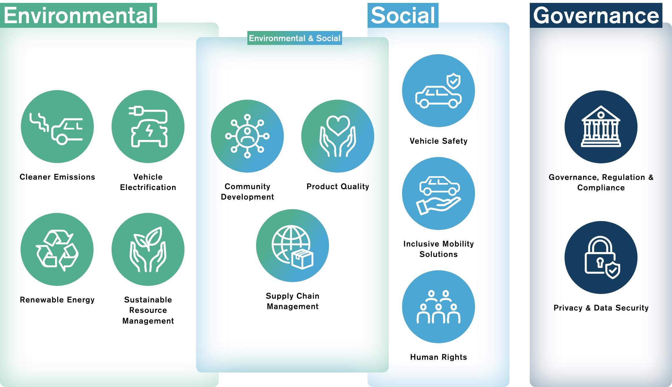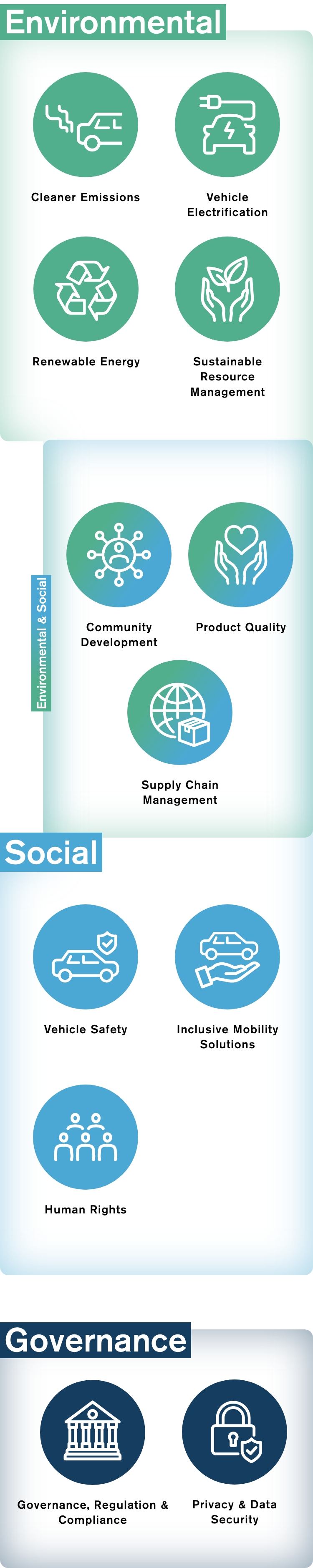 Nissan's materiality assessment identified 21 items of materiality and every issue is material to Nissan's long-term sustainability. Nissan determined 12 items as the most important materiality items. Nissan will incorporate each of the identified items into its business activities to expand opportunities for collaboration, leading to the promotion of more robust efforts embodying our corporate purpose.