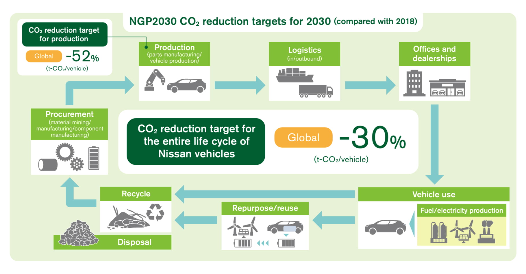 Nissan is actively working on reducing CO2 emissions across the entire lifecycle of its vehicles. We are promoting the development of new technologies and the introduction of renewable energy in the entire value chain, including suppliers, to achieve CO2 reduction at every stage, from raw material extraction to manufacturing, transportation, product use, and disposal.
